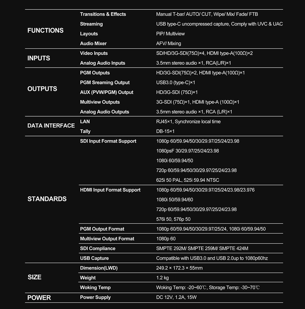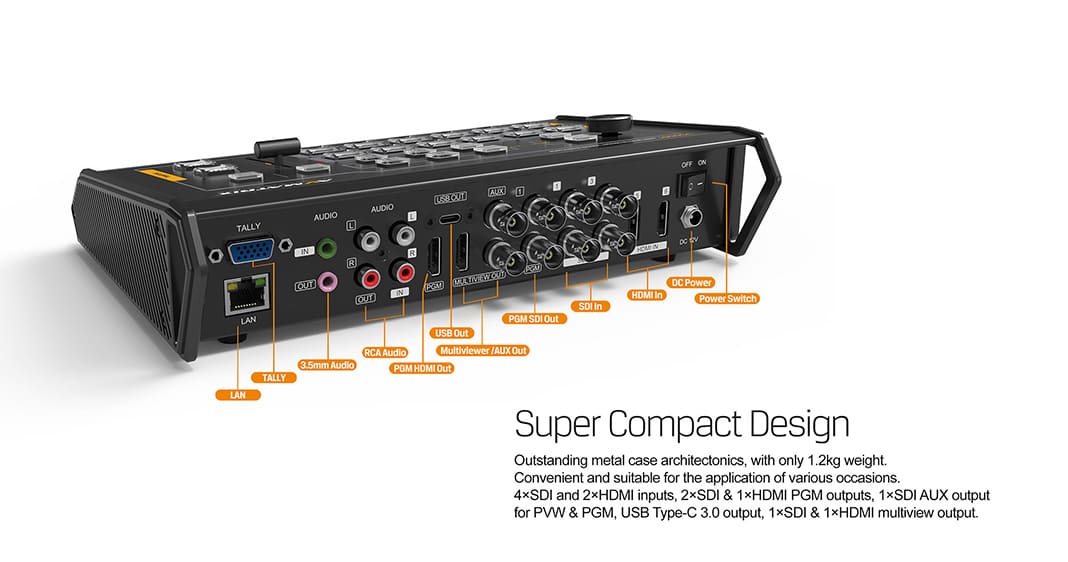 • Bộ trộn âm thanh với đầu vào và đầu ra âm thanh 3,5 mm và RCA, cùng với âm thanh nhúng USB Type-C, HDMI và SDI.