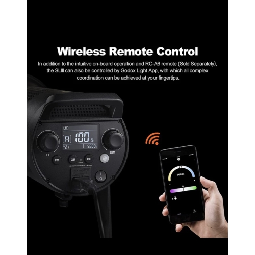 Hoạt động tích hợp trực quan, điều khiển từ xa RC-R9 tùy chọn và điều khiển không dây từ điện thoại của bạn với Ứng dụng Godox Light