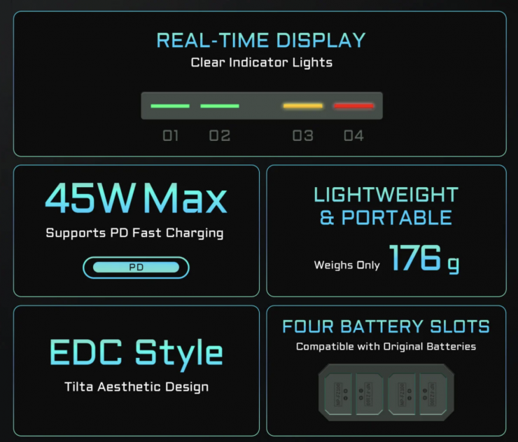 Đèn báo trạng thái sạc theo thời gian thực giúp bạn biết được trạng thái của từng pin và thiết kế nhẹ giúp sản phẩm chỉ nặng 176 gram, đảm bảo dễ dàng mang theo khi di chuyển.