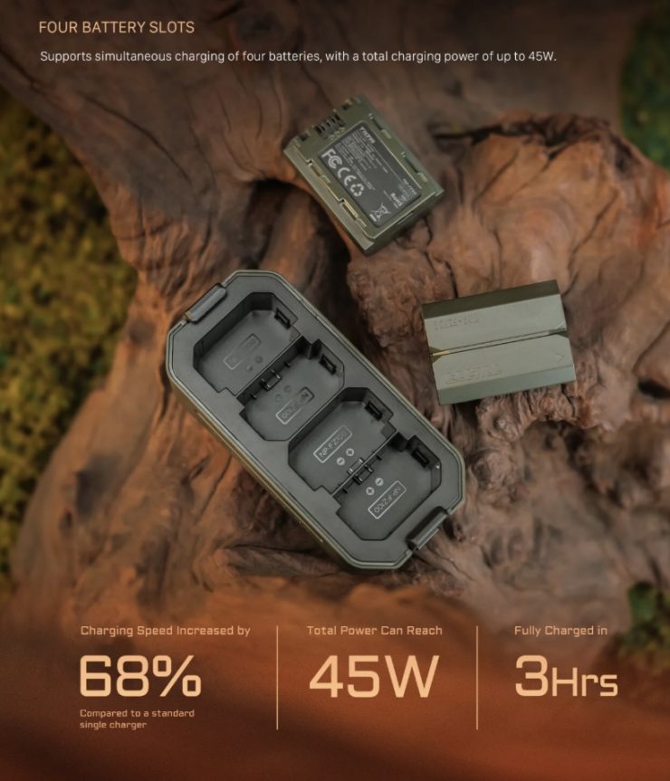 Trạm sạc nhỏ gọn này được thiết kế để hỗ trợ pin Sony và pin NP-FZ100 của bên thứ ba, cung cấp bốn khe cắm để sạc dễ dàng và cất giữ thuận tiện.